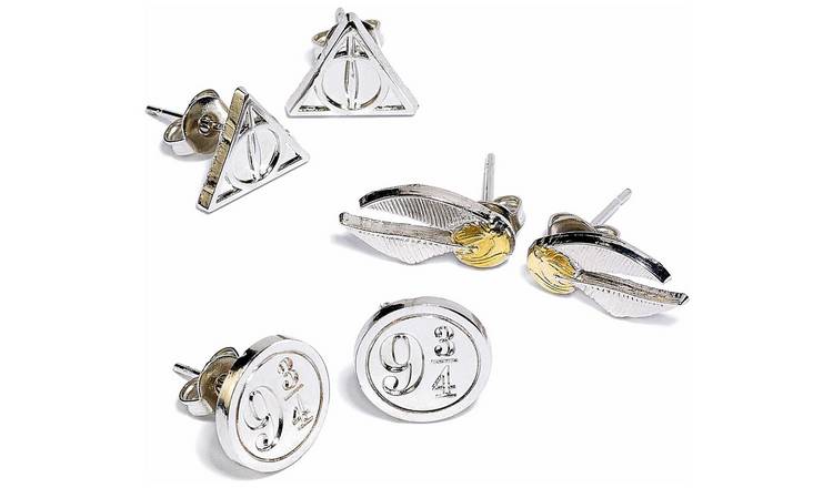 Amazon Com Harry Potter Jewelry For Women And Girls Silver Plated Snitch Harry Potter Logo Deathly Hallows Emblem 3 Piece Stud Earrings Set Jewelry
