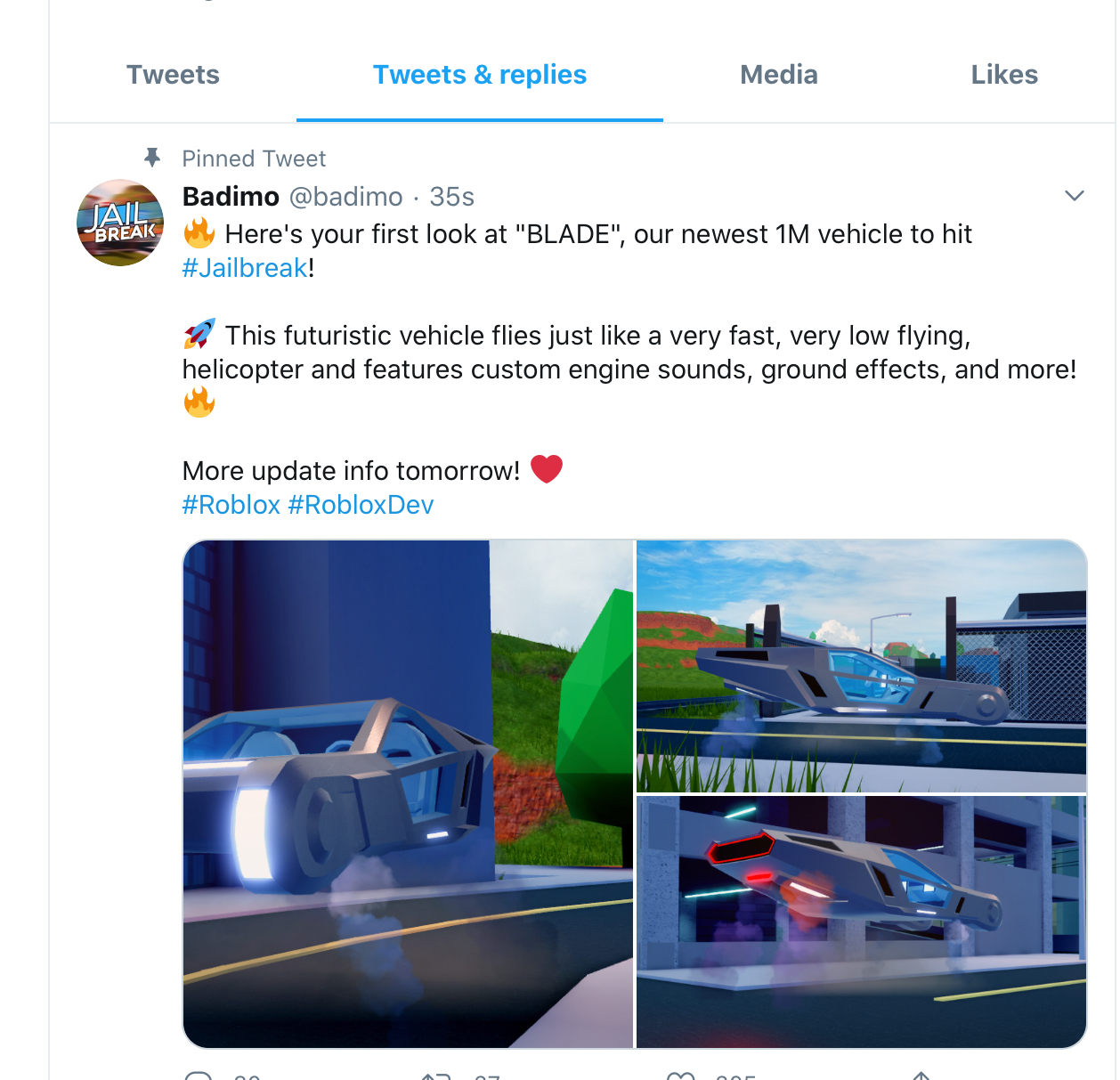 Badimo On Twitter Here S Your First Look At Blade Our Newest 1m Vehicle To Hit Jailbreak This Futuristic Vehicle Flies Just Like A Very Fast Very Low Flying Helicopter And